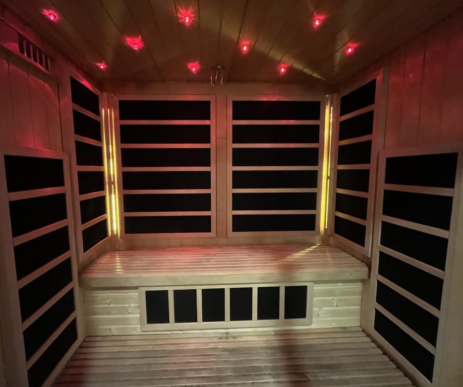 Den infraröda värmen ger effekter som både syns och känns. Kännetecknande för infraröd bastu är att den tränger djupt in i vår organism och värmer upp kroppen inifrån. Värmen tränger upp till 3 gånger så djupt in i kroppen som vid traditionell bastu. Värmen når ca 4,5 cm in i vävnader och leder och är mycket effektivt för att mjuka upp spända och ömma muskler samt lindrar stelhet och värk. Att avvara 15-20 minuter i denna bastu ger dig fina effekter och en avstressande stund!