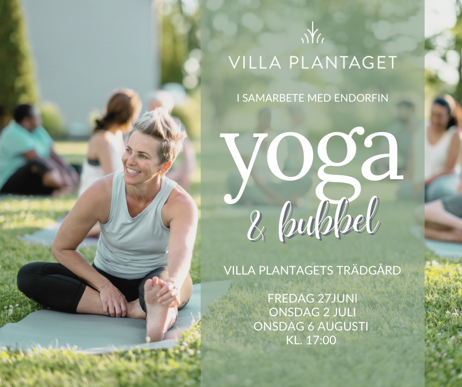 Varmt välkommen till Endorfins och Villa Plantagets Yoga in the Park & Bubbel i Villa Plantagets Trädgård! Yoga under bar himmel med härliga ljud av naturen som inslag. Tag med egen yogamatta/handduk och tröja/filt.